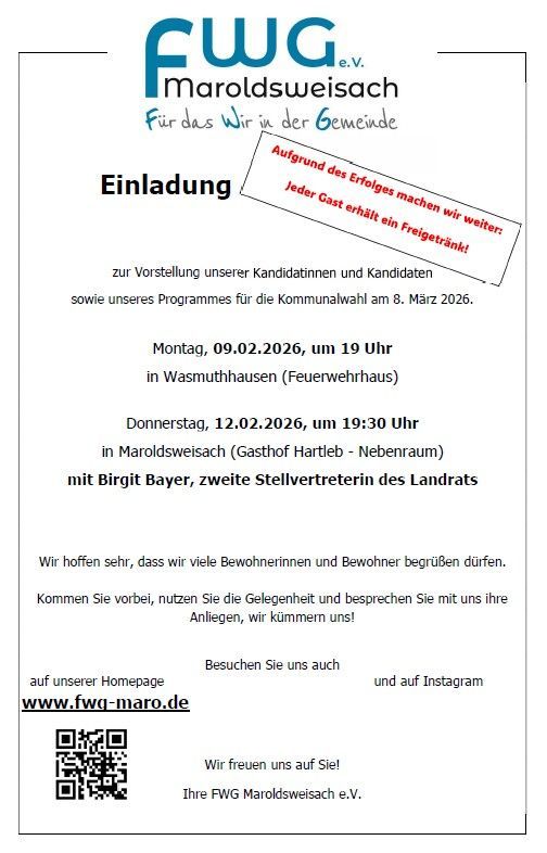 Die FWG ist für die bevorstehende Wahlkampagne sehr gut gerüstet und strebt im Namen aller Kandidatinnen, Kandidaten und Unterstützer der FWG Maroldsweisach für die Marktgemeinde faire und sachlich-konstruktive Begegnungen an.