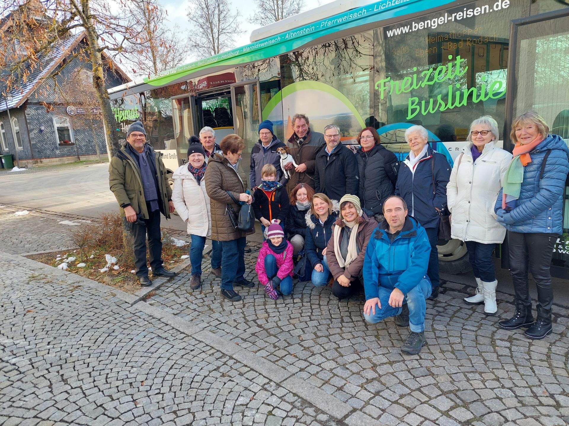 …unter diesem althergebrachten Motto fanden sich auf Initiative der FWG Maro e.V. am 2. Dezember fast 20 Fahrgäste ein, um den regionalen ÖPNV und die Freizeitlinie „HeimatHopper“ zu stärken. Über Hellingen und Heldburg (die Linie hält übrigens direkt oben an der Veste!) ging es mittags ins winterliche Bad Rodach, wo im „Stadtcafe“ ein paar gesellige Stunden verbracht wurden, bevor uns der Bus wieder warm und gemütlich zurück nach Maroldsweisach brachte. Nicht nur die Teilnehmer waren begeistert: auch der Busfahrer zeigte sich vom großen Ansturm auf die Fahrkarten positiv überrascht. So herrschte zum Abschied auch Einigkeit: Der „HeimatHopper“ ist eine Reise wert und die Mitfahraktion muss wiederholt werden!