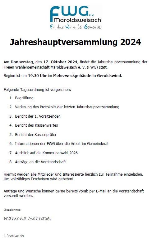 Am 17.10.2024 fand im Mehrzweckgebäude Geroldswind die Jahreshauptversammlung der Freien Wählergemeinschaft Maroldsweisach e.V. statt.
